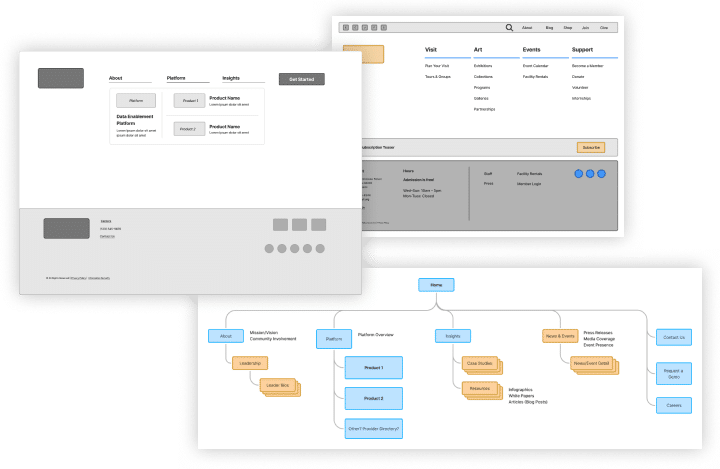 We develop an intuitive site map that serves all of your audiences, guiding each type of user to the content they need. We employ familiar and intuitive user experience (UX) patterns for navigation and wayfinding throughout the site. A wireframe of your site’s navigation system helps everyone visualize how it will all come together.