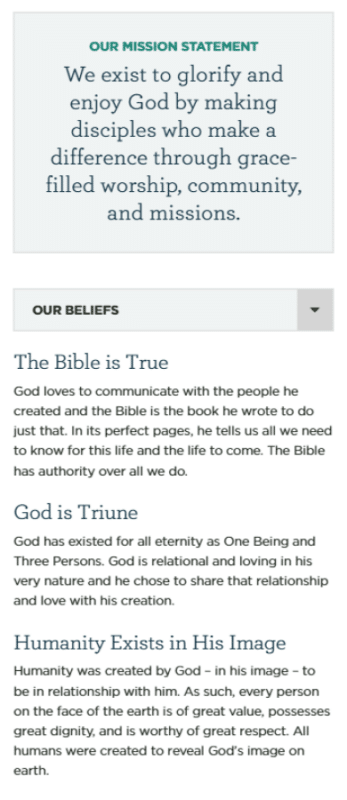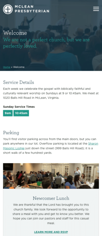 We prioritized the needs of visitors throughout the design process, creating a navigation scheme that makes it easy to find the right campus and get service details in a matter of seconds. Areas of the site that are more likely to be accessed by existing members and attenders are tucked into the secondary navigation bar or the slide-out panel. This reduces visual clutter for first and second-time visitors, but still keeps tools like the event calendar and member log-in easy to find for “insiders.”