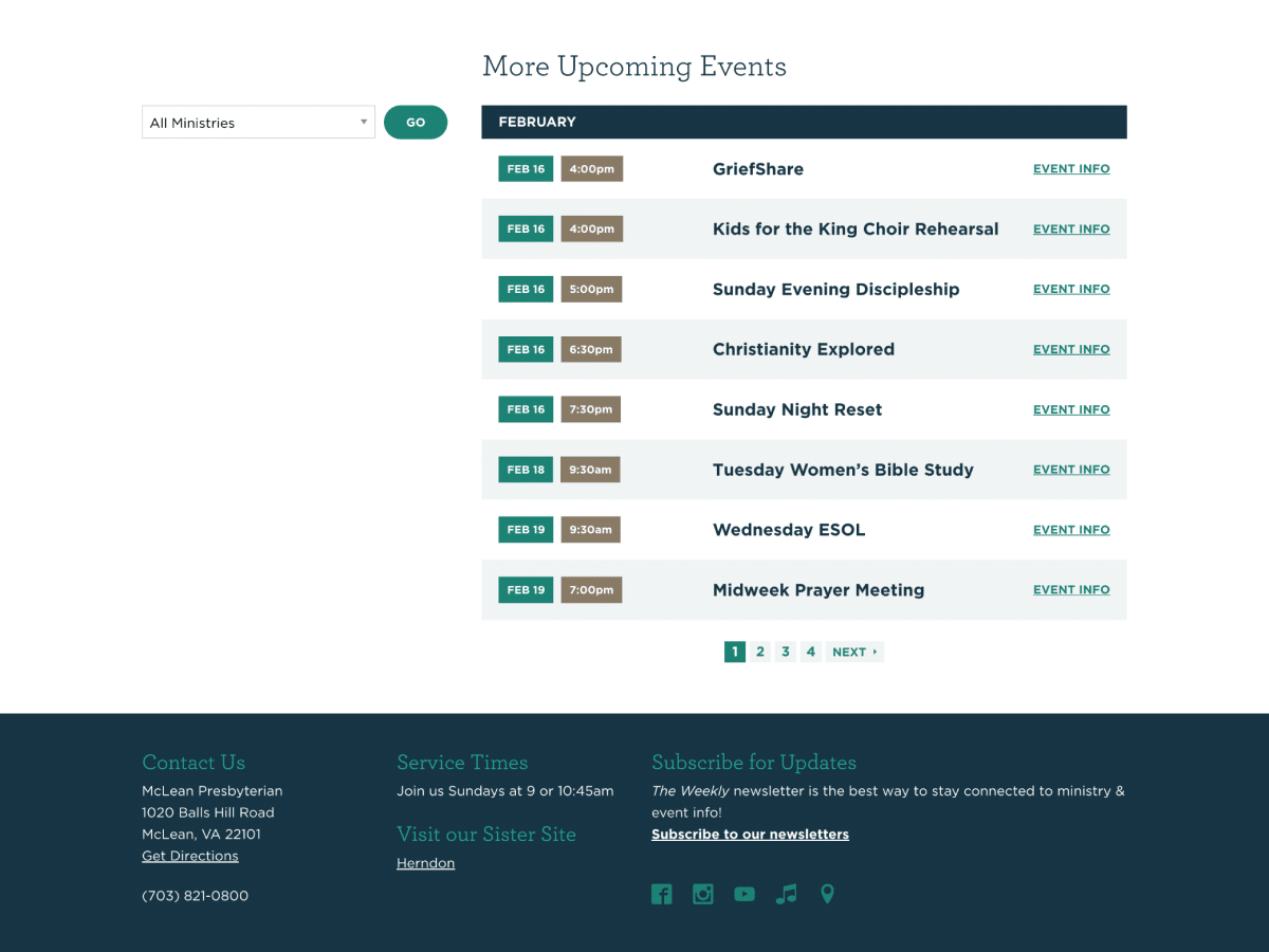 While the church only had one satellite campus at the time, they expect to keep growing quickly. The campus-specific area of the website can be replicated as new locations are added, so that the website scales seamlessly.