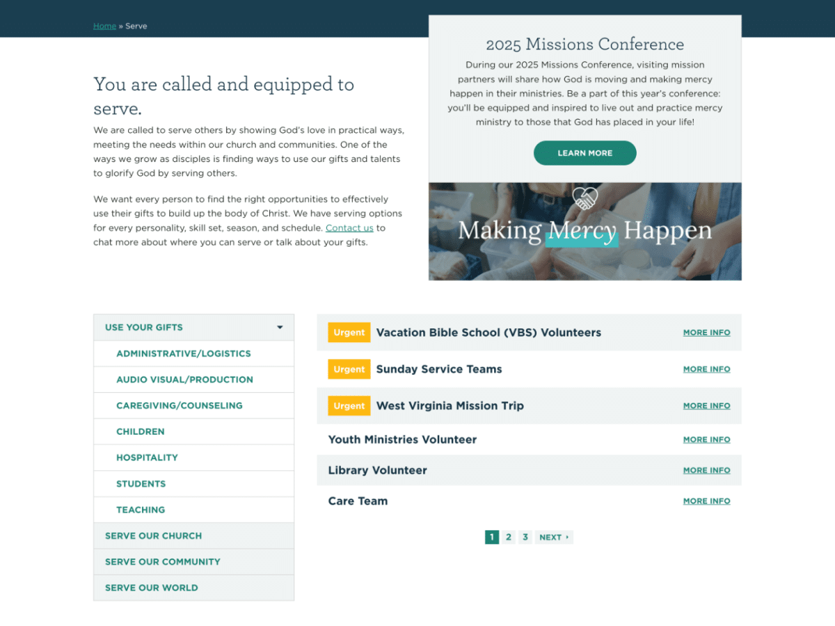 We prioritized the needs of visitors throughout the design process, creating a navigation scheme that makes it easy to find the right campus and get service details in a matter of seconds. Areas of the site that are more likely to be accessed by existing members and attenders are tucked into the secondary navigation bar or the slide-out panel. This reduces visual clutter for first and second-time visitors, but still keeps tools like the event calendar and member log-in easy to find for “insiders.”