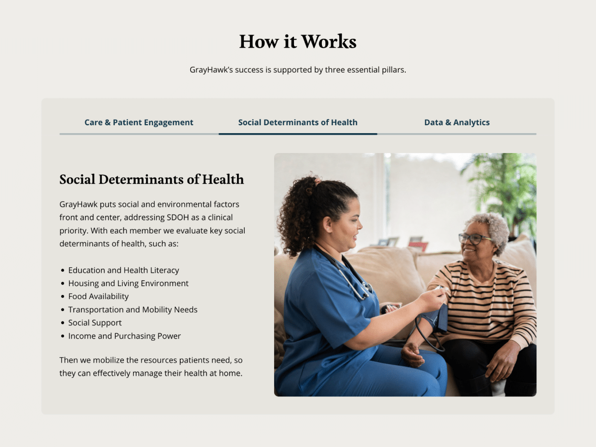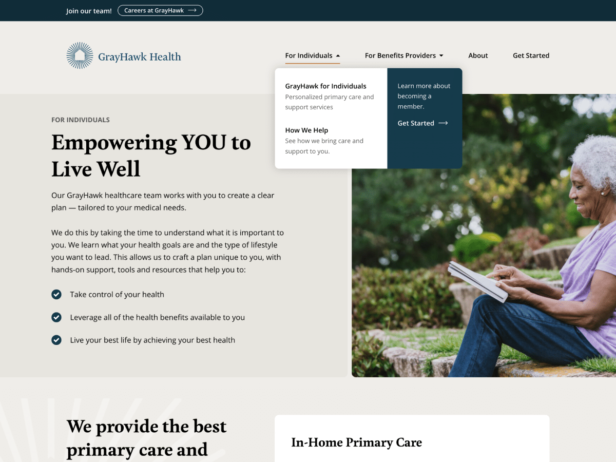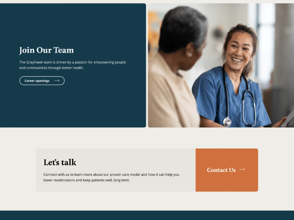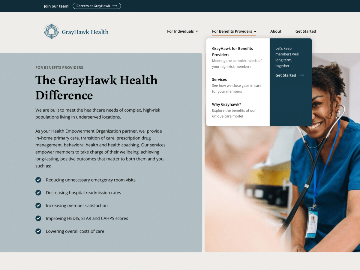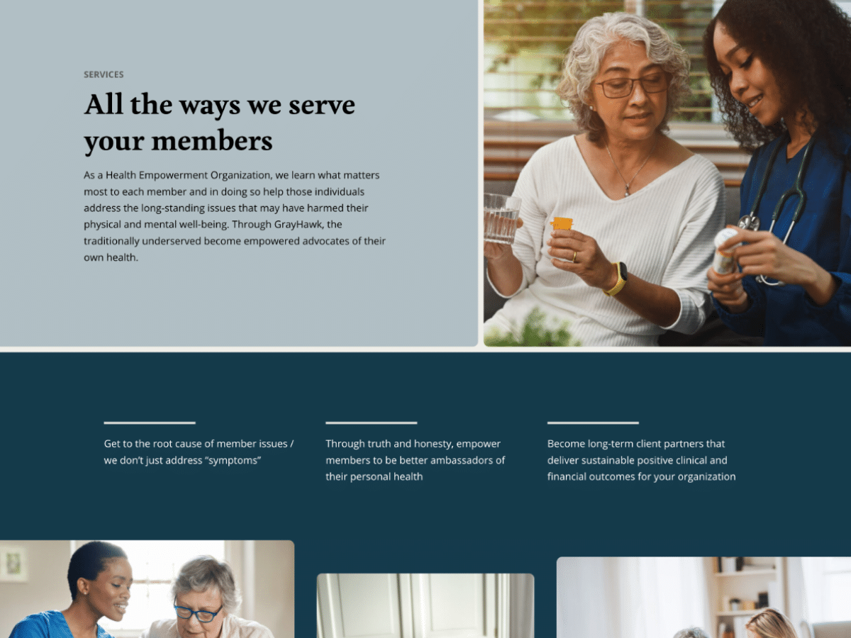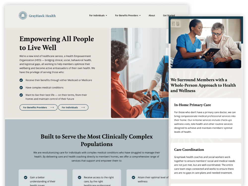 GrayHawk Health is an innovative healthcare company serving the most clinically complex populations as a health empowerment organization (HEO). We partnered to build an online presence that effectively communicates the company’s mission to bridge clinical, social, behavioral health, and logistical gaps for individuals with complex medical challenges. We focused on creating an intuitive, user-friendly website that serves benefits providers who can contract with GrayHawk, and the individuals they serve.