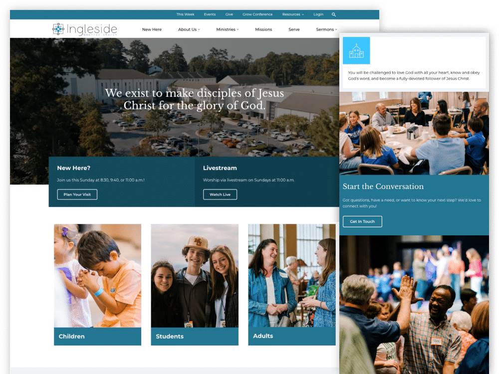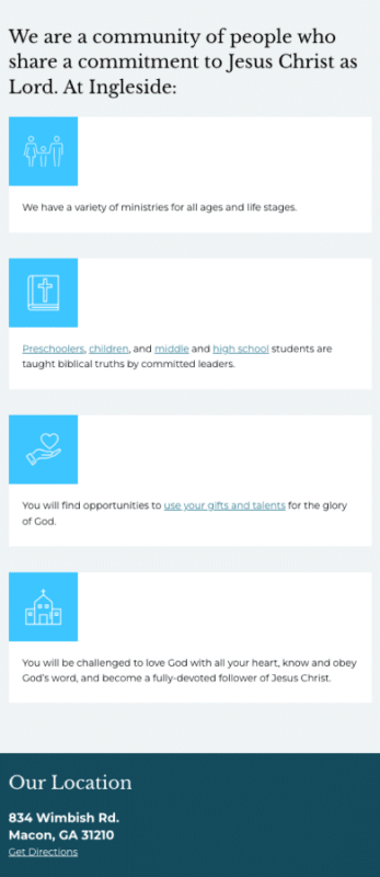 Ingleside Baptist Church in Macon, Georgia is a large, single campus church that emphasizes excellence in all things. We created a website design that carefully matched their brand style guide with a polished, professional finish.