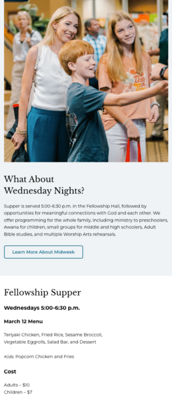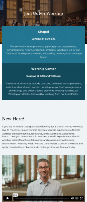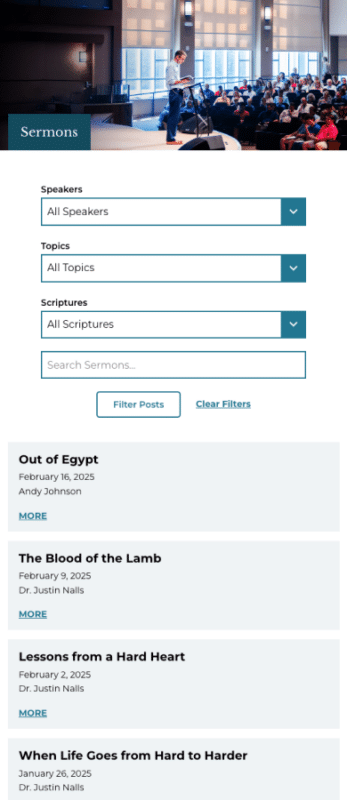 Extensive features, including a sermon archive, resource library, event calendar API integration with their ChMS, and automated mission and study listings, make it possible for a small team to efficiently manage a large website.