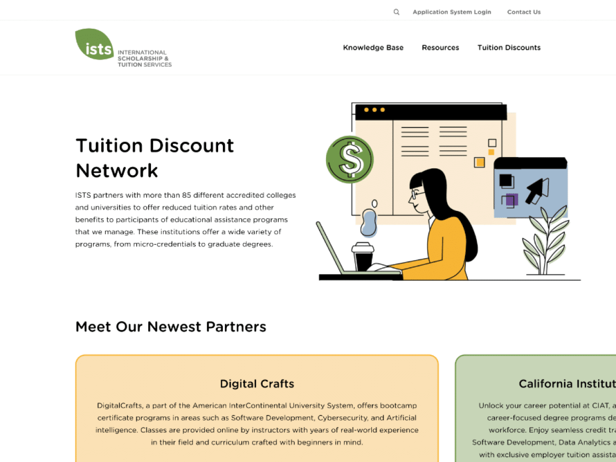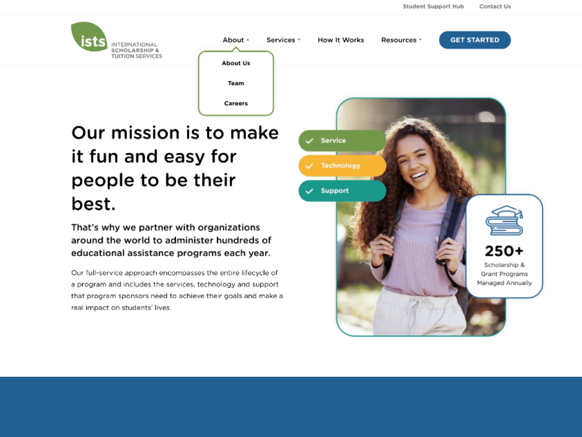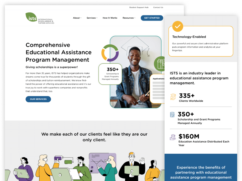 We redesigned the website for International Scholarship & Tuition Service (ISTS) website to reflect their energetic and optimistic brand personality. They love equipping companies to provide scholarships and grants, and we built a website that would let that shine through in the photo treatments, illustrations, color palette and fonts. We reworked the site map and wrote and optimized the website content for improved search engine performance and a simplified user experience. The site is easy for admin to add and update content as they grow.