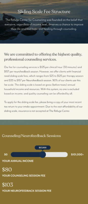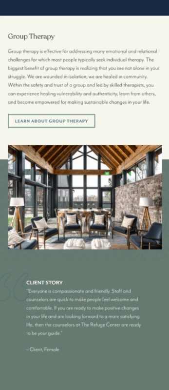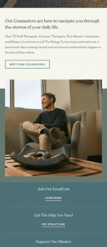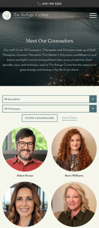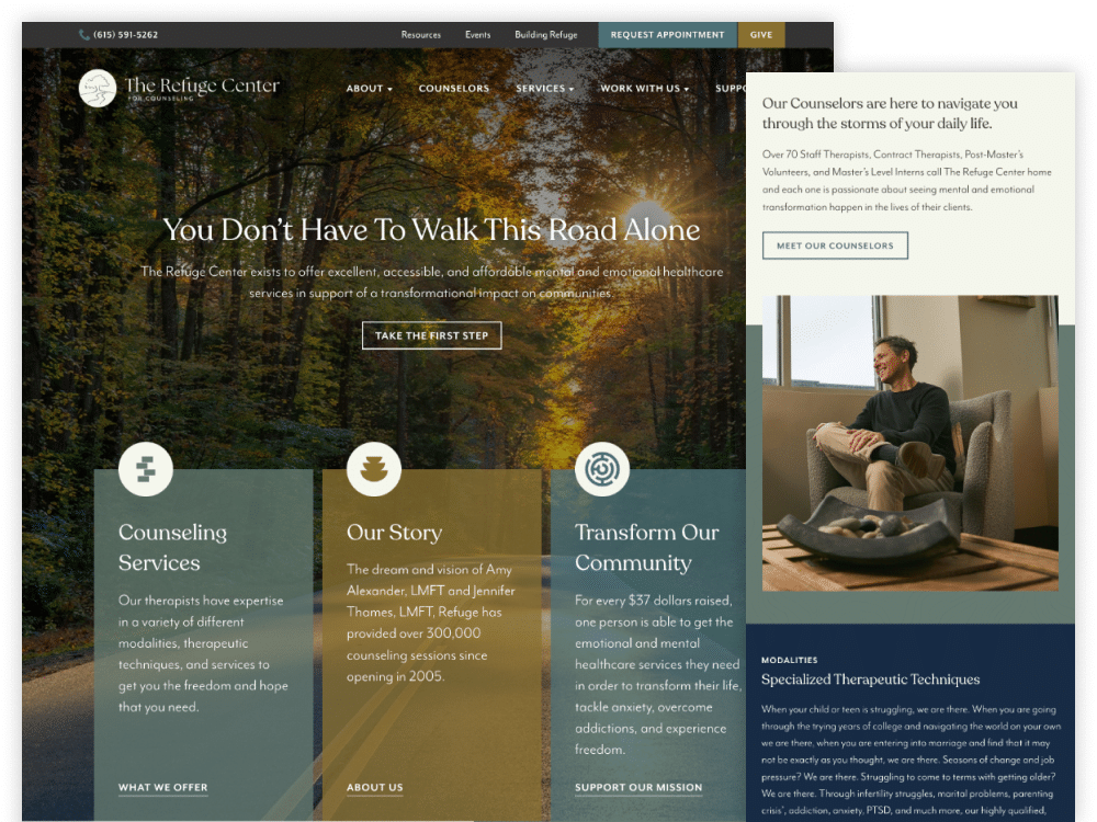 We came alongside The Refuge Center to completely reimagine their website, updating it to match their new visual branding while balancing the needs of their multiple audiences. We created a robust counselor finder tool, a resource library, and an interactive sliding fee scale. The new website design and messaging bring their powerful stories of life change to the forefront to drive appointment requests and donations.